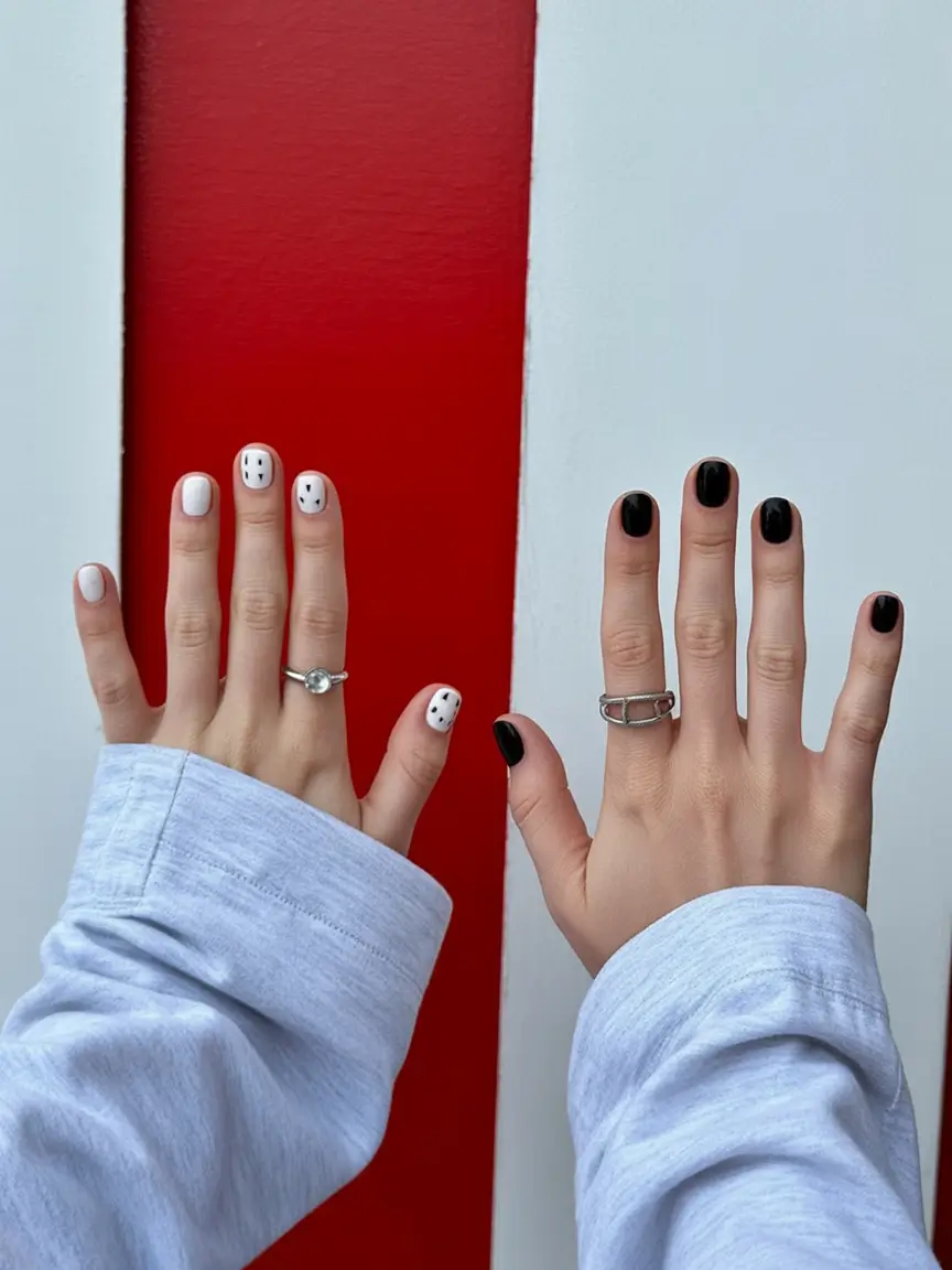 Black and white are what will never go out of fashion – not even in winter. This mix is contemporary and somewhat edgy, yet it is playful due to those minimalistic dots and mix-and-match contrast. I would call it cute winter nails acrylic short black with an artistic touch to it – it is delivering the feel of a fashion-student in Paris, and I am obsessed.