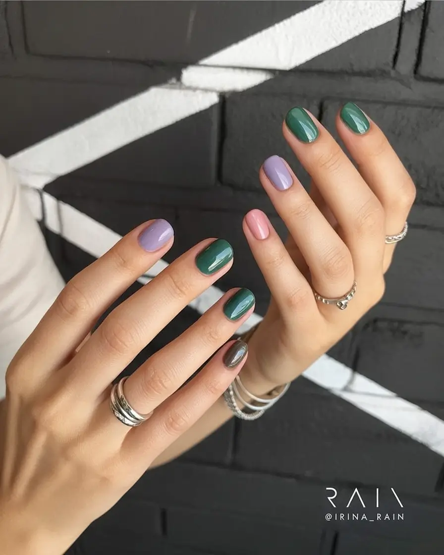 Dark emerald and light lilac form the right combination of warm and cool. The opposition is on purpose, fashionable, somewhat mysterious, like winter evenings when all is silent but alive, and the air smells of pine. The dark green grounds the appearance and the pastel shades add a touch of a playful element, making this winter nail polish a fashionable and yet comfortable color to apply to nails at any time of the year.