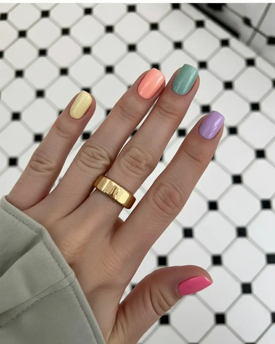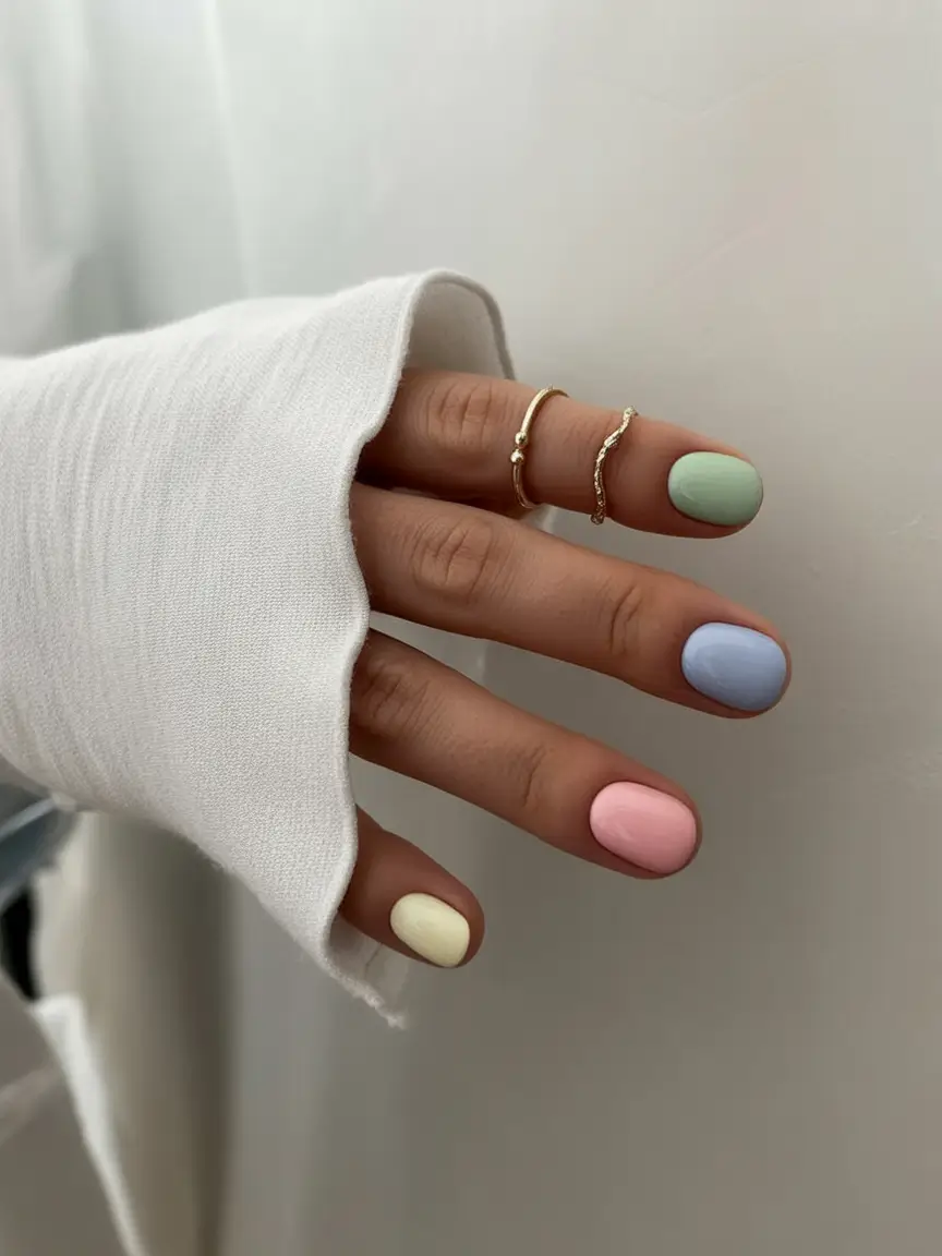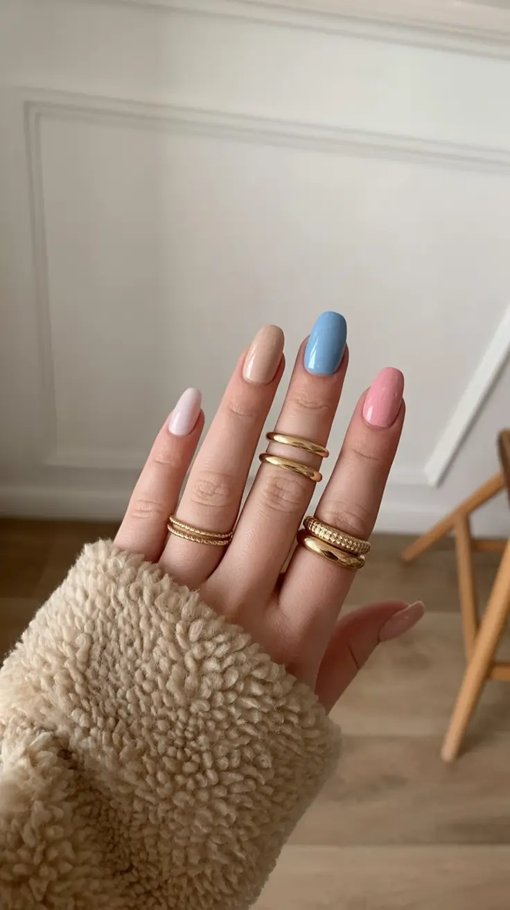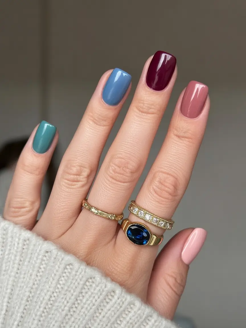 A mix of teal, powder blue, mauve, burgundy and blush – this appearance seems to be the most wearable cold-day rainbow. It is happy and natural, daring and moderate. Combination of jewel and pastel colors reminds us of the direction of jewel nails to 2025-2026, in which strictness and color rules are fading out in favor of self-expression.