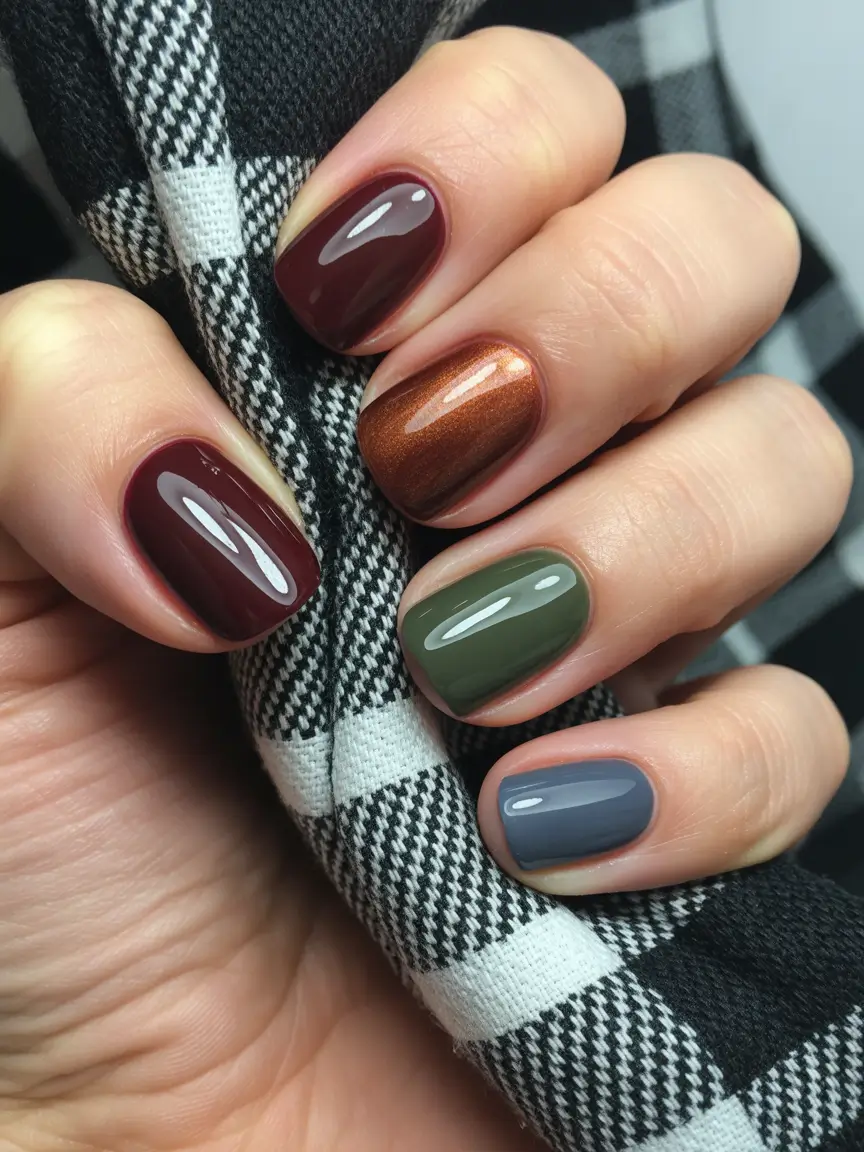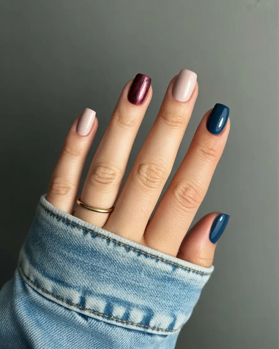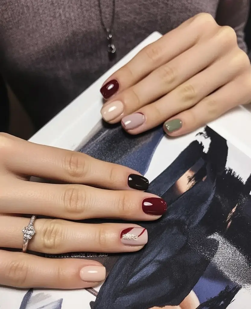 This palette reminds of winter evenings by the fireplace – warm, earthy and luxurious without noise. The combination of deep burgundy, copper shimmer, muted green and slate gray creates a tone of moody but elegant harmony that perfectly reflects the colors of winter manicure of the year 2025-2026. It is the type of glance that turns your hands immediately dressed even when you are dressed in plain flannel only.