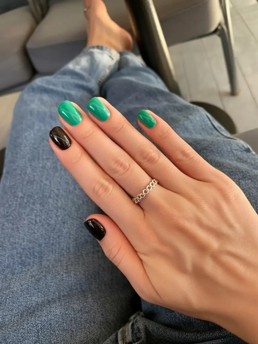 This one is all contrast, that mysterious attraction of black combined with the brightness of the emerald green. It is impressive, smooth, and admittedly classy. This design is literally the nail of winter, except that it is bold and wearable, a solid gel manicure in one.