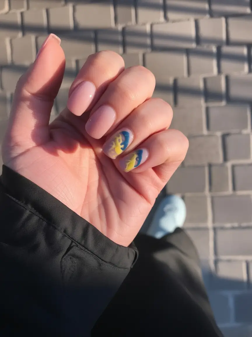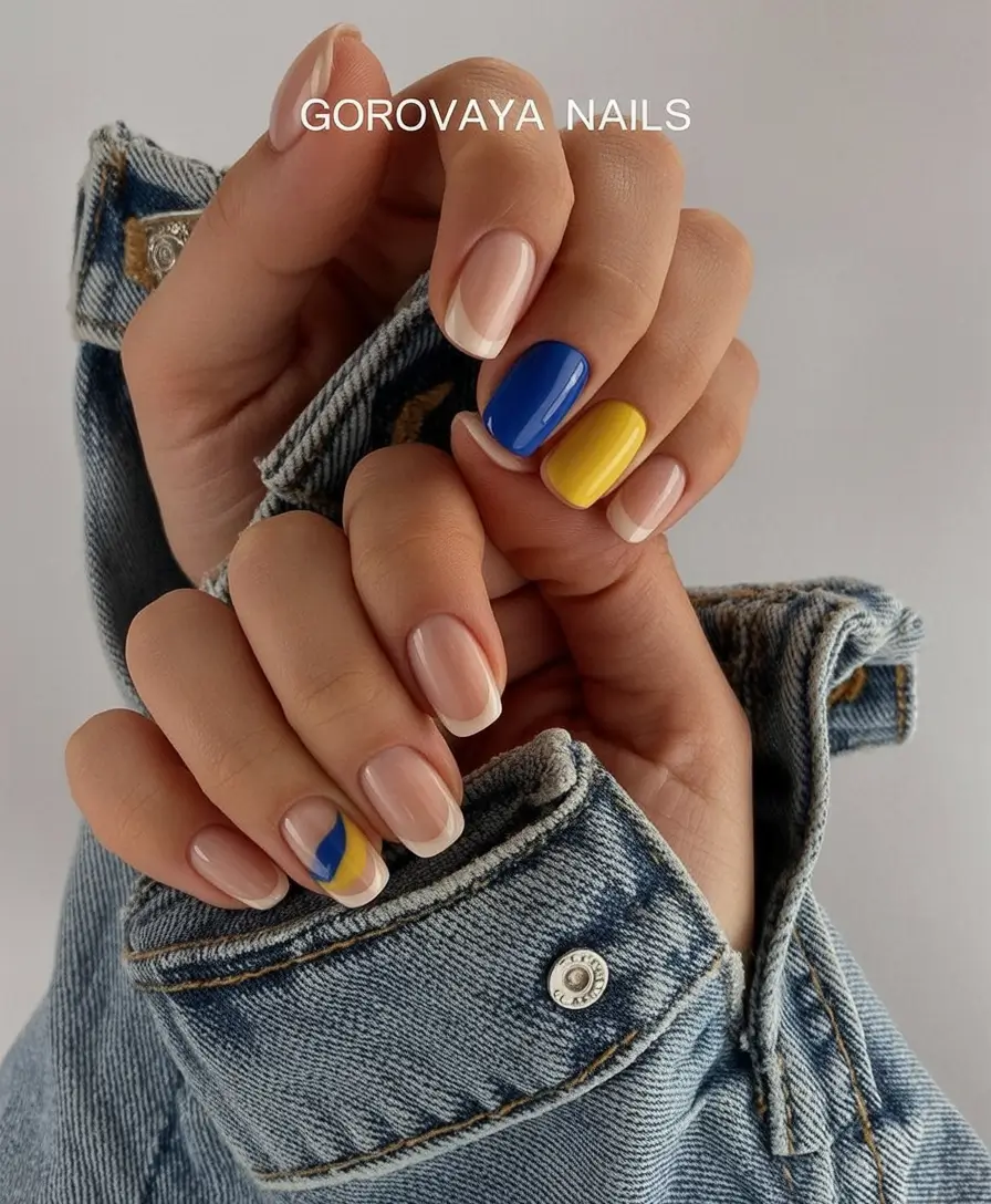 In order to reproduce it, one should begin with a light nude base such as OPI Bubble Bath. In the case of the tips, apply white gel polish with the help of a thin liner brush. Next put on solid blue and yellow nails with Essie Butler Please and Sunshine State of Mind. It is a visual opposition that is statement-making without screaming.