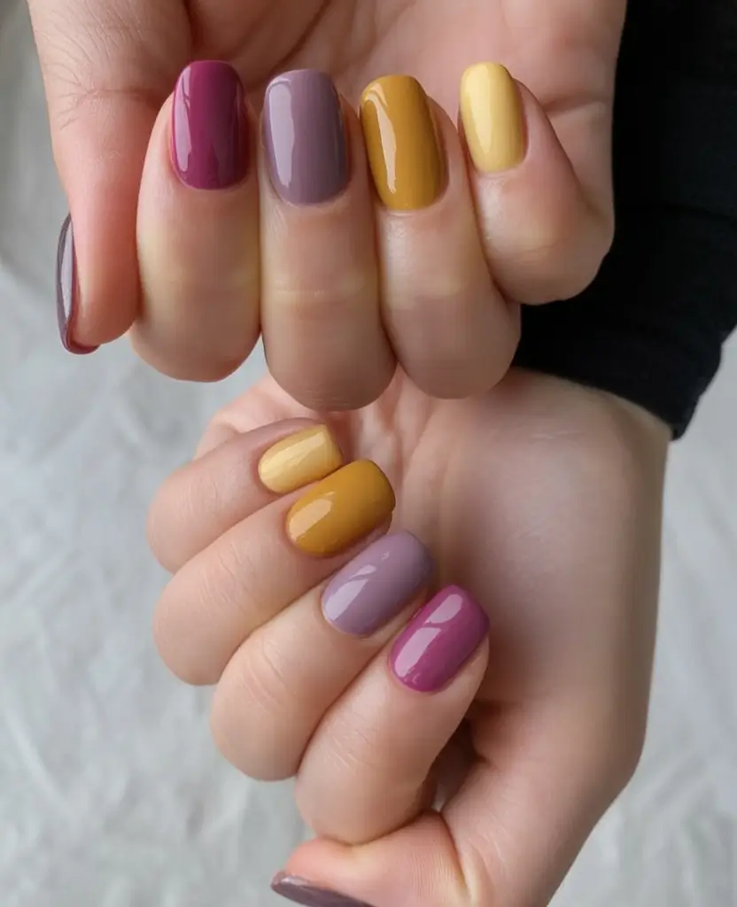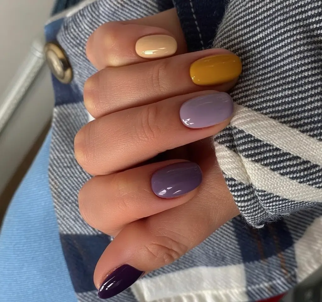 Use a neutral shade as your initial layer, and mix between purple and mustard. have nails short and rounded. As nail artist Jin Soon Choi says, it is weird combinations that make color usable in all seasons, and this design nails this philosophy down.