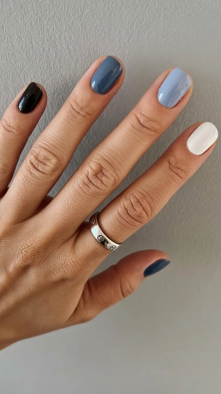 This pedicure is the winter morning and it is cold, calm and confident. The midnight blue, slate and ivory combination is a clean, urban feel that works well with denim jackets and oversized scarfs. It is one of those winter color gel manicure concepts that does not demand attention but well deserves it.