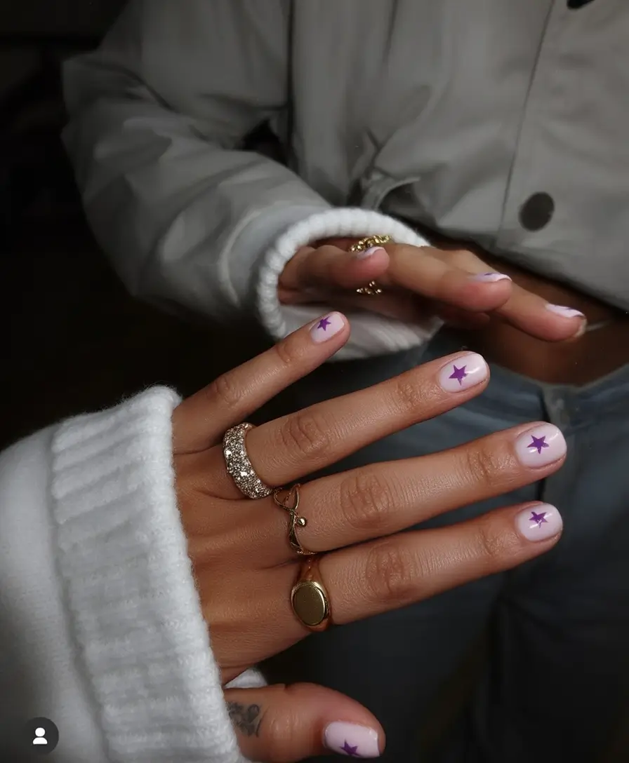 To get it, I prefer applying a clear foundation such as Essie that is called Ballet Slippers and placing few lavender decals or stamping stars with the help of Orly that is called Scenic Route. The result? A moody, clean and so practical manicure that is more a mood than a statement.