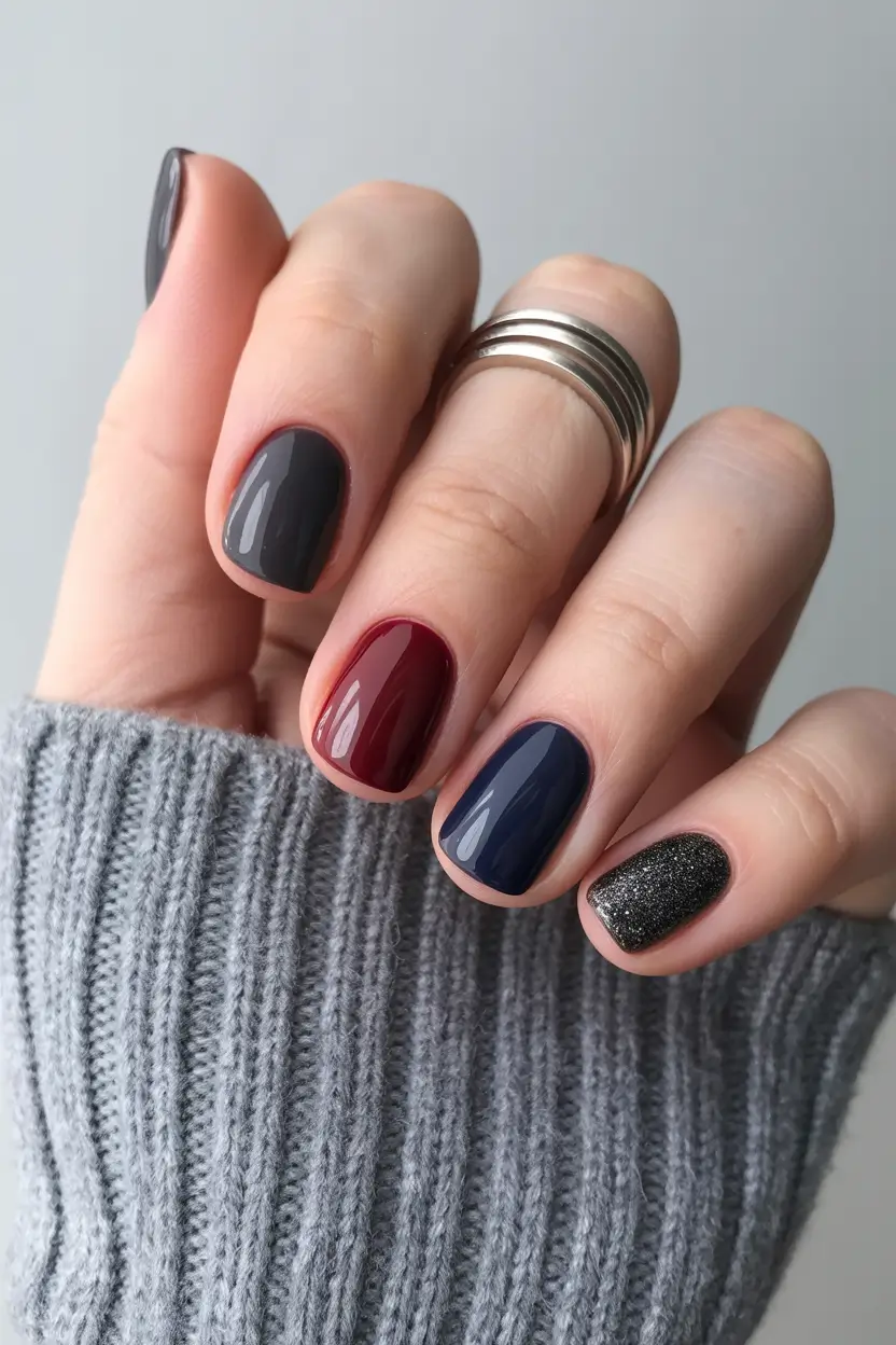Daring, dramatic, and irresistibly stylish – this style mixes dark red with dark blue and dark black with a dash of luster. It is the definition of luxury with no effort, which is ideal to anyone that desires a gel manicure solid color winter look that is both strong and comfortable to wear.