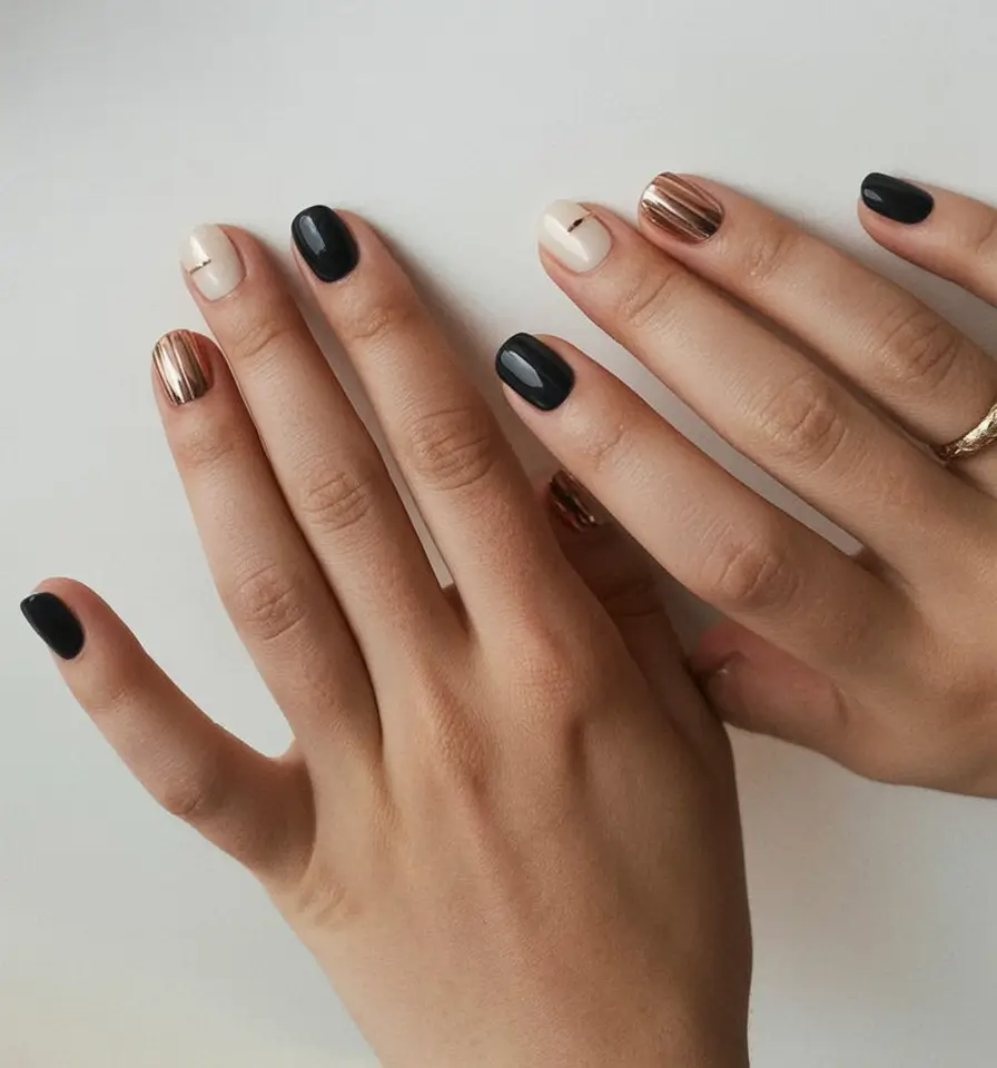 Black, beige, and metallic red gold – it is one of those blends that will scream of refinement. The juxtaposition between matte black and reflective chrome immediately exudes the editorial chic vibe, the type of winter manicure colors that seems to be eternal and still very modern. Even its design is simple – smooth lines, equal colors, no unnecessary decorations. It is the nail of a perfectly fitted coat of winter.