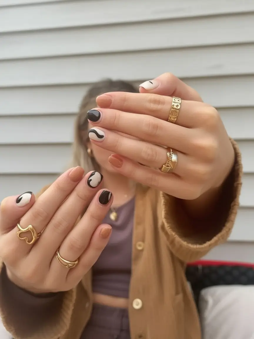 This swirl pattern combines coffee browns and milky beige with a little bit of black – it is as though a latte has been brought to life. Cute and mild, this winter manicure nail colours trend adds some retro 70s to the winter months, putting even the most basic dress in an artistic spin.