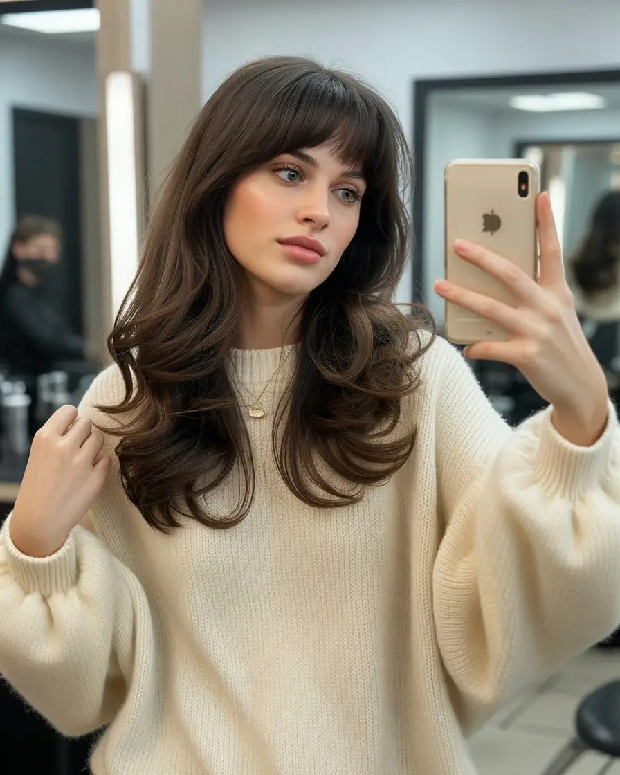 Something old-fashioned about long, soft, waves and curtain bangs. It is feminine, versatile and it fits the face perfectly without being heavy. The waves make it romantic, whereas the bangs make the silhouette overall soft, the kind that those who desire a carefree appearance with yet a polished look would choose. This certainly qualifies as cute winter haircut since it is easy to wear with scarves, hats, and all of that layering that we adore.