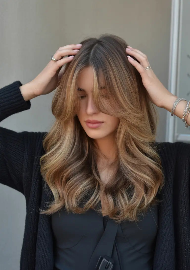 Warm Balayage with Curtain Bangs