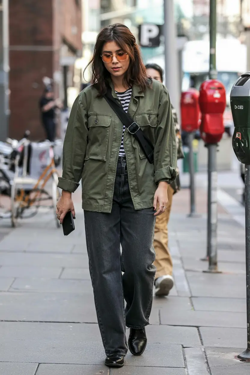 I would like to begin with one of my favorites: this outfit seems to be a capsule wardrobe that a cool weather casually entered your life. And the overshirt, army-green and layered over a traditional striped tee and faded black wide-leg jeans, strikes the right balance between practical and Parisian, the message is that she knows what she is doing without ever trying too hard. The gold rimmed glasses and the slight leather cross body binds the entire thing together in that casual fall style.