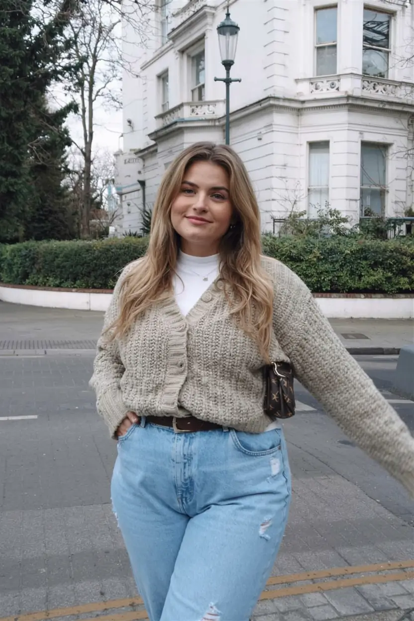 This is fall layering at its most wearable. The waistline of the knit is at the waist, and that is so flattering to a midsize frame, and the jeans are distressed so that they have a little bit of an edge. The proportions are united with a thin black belt that forms a distinct shape of the entire outfit. If you’re someone searching for midsize fall outfits casual, this one’s basically made for you.