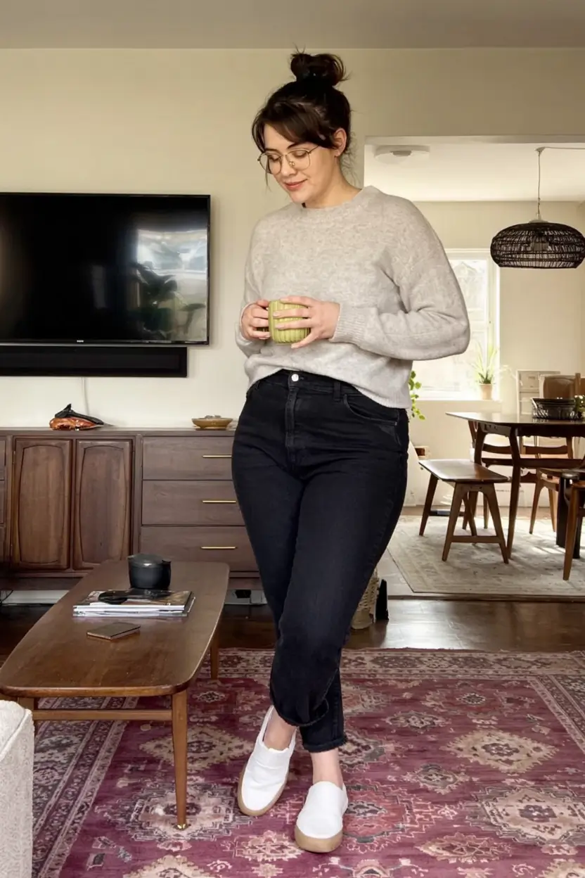 The thing I like about this appearance is that all the items are customized to make one feel at home without making it seem like loungewear. The jeans embrace where they should and not too much, and the sweater is right at the hip, the best place to bring out a natural waist. It is also an excellent choice of midsize casual fall outfits 2025 that can be used as Zoom calls or spontaneous events.