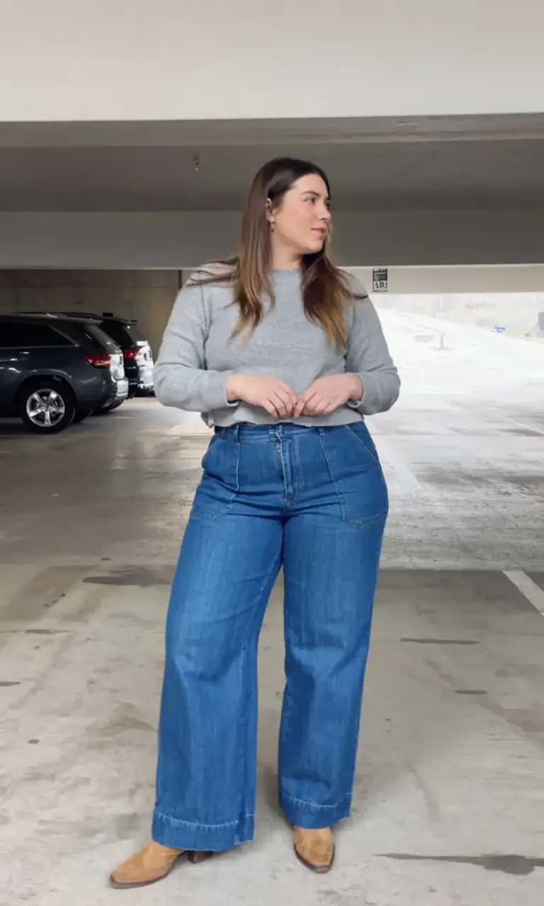 This look is giving modern cowgirl, minus the clichés. A long-sleeved heather grey shirt poking out of ultra-high-waisted wide-leg jeans with clear front seams and, yes, pointy western boots visible at the hem. This is confident denim, and it completely fits into the midsize fall outfits 2025 jeans.