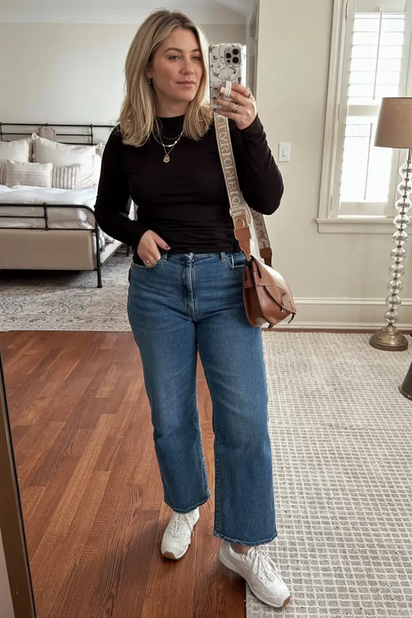 It is that outfit that you go to without even recognizing it. This is that. Chocolate brown fitted long-sleeve, mid-rise jeans and white athletic sneakers- simple, flattering and just enough sporty. The tonal crossbody and gold jewelry are minor details that make the entire outfit a touch more impressive.