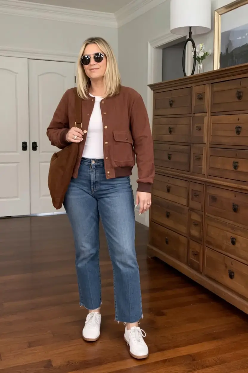 The warm rust bomber jacket, the straight cropped denim and the classic white sneakers fall in an outfit. This ensemble of cream tee and chocolate suede tote is clean, purposeful, and up to date with leaf heaps, weekend chores, or a relaxed workplace.