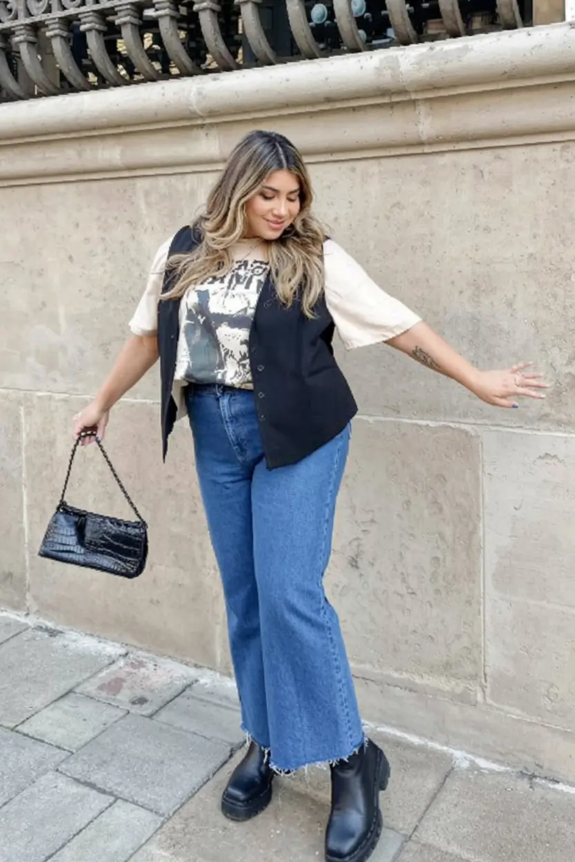 This look is a masterclass in attitude. The tee and sleeveless vest in black that gives it that rock-and-roll feel and the straight cut, raw hem jeans and chunky black boots make it all grounded and confident. It is providing edginess without trying hard- cool-girl vibes on a chilly city day.