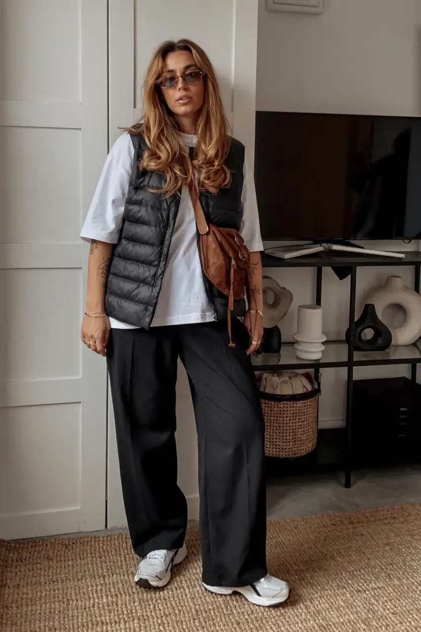 This ensemble is a hug of your coolest friend. Large tee, puffer vest, broad black pants, and gray dad sneakers, all of which are utilitarian items, but in a completely contemporary manner. It is casual yet there is a certain big-city sheen to it.