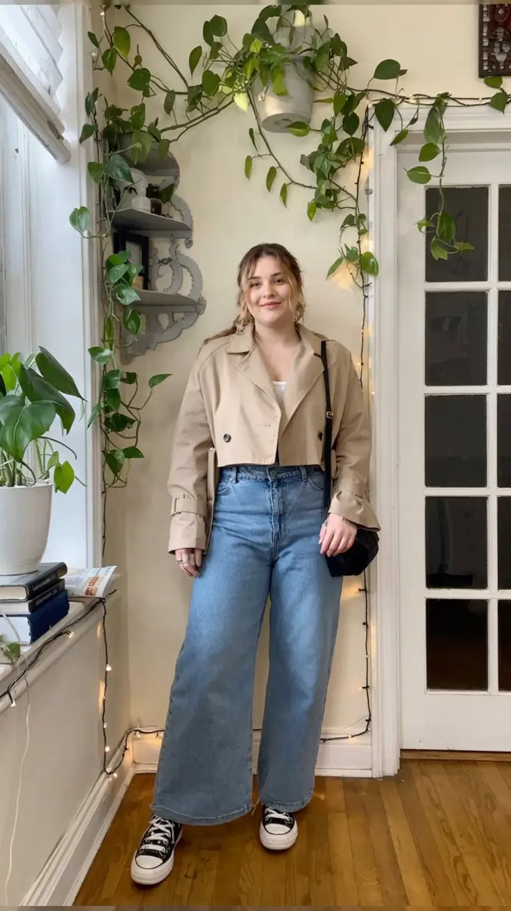 This look brings a fresh innocence to fall styling. The beige trench is cropped and a fun twist on a classic, with the wide-leg retro-wash jeans, and black Converse-style sneakers. It’s clean, flattering, and absolutely wearable at any age.