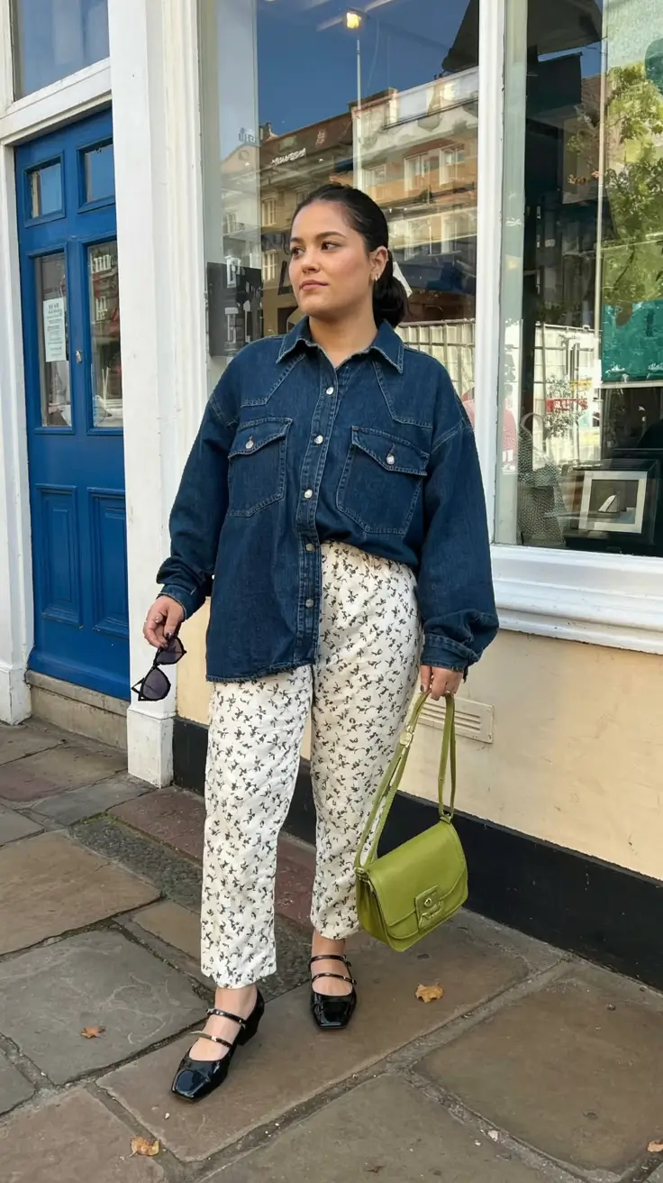 Unexpected and adorable—that’s this look in a nutshell. A tailored dark denim shirt that is oversized on top of floral cigarette pants, and completed with Mary Jane flats and a new chartreuse green shoulder bag. It is serving French vintage with Gen Z lens.