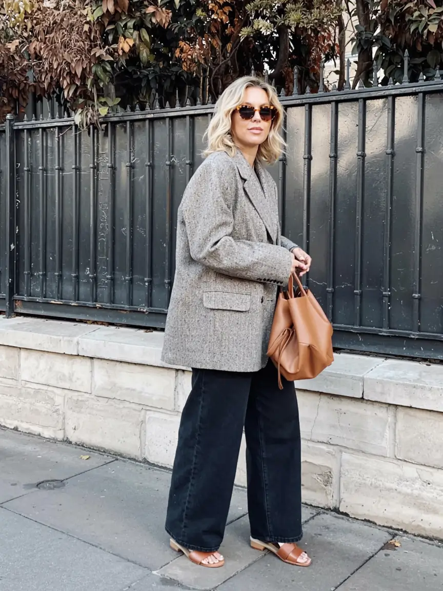 The over-sized blazer makes the outfit age-appropriate, and the wide-leg jeans maintain shape and structure, which is essential when creating a midsize fall outfits 2025 going out outfit that will not seem overdone. I adore the fact that the accessories are not accidental: the bag and the shoes are like a little fashionable dialogue.