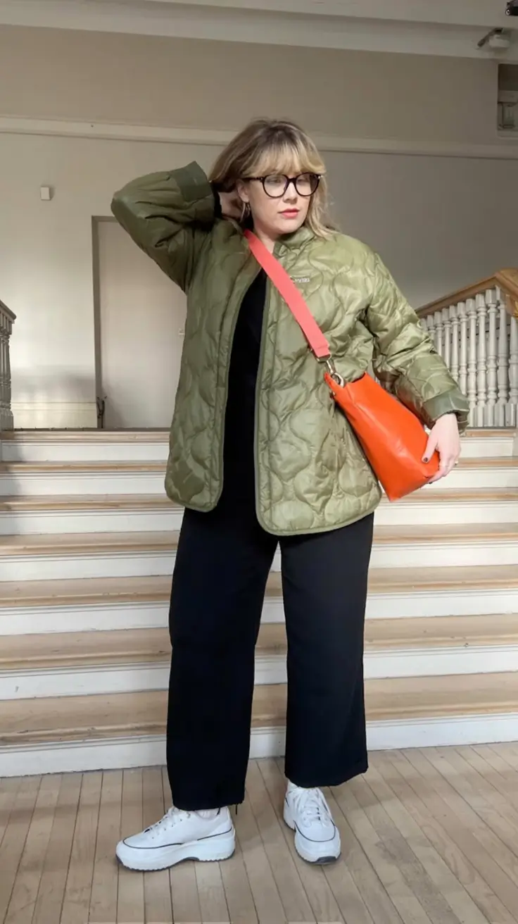 This look screams practical cool. The olive quilted jacket has volume all in the right places and looks great with black trousers, the white high-top sneakers. But that fiery orange bag? Total scene-stealer. Fall 2025 does not fear color and neither should you.