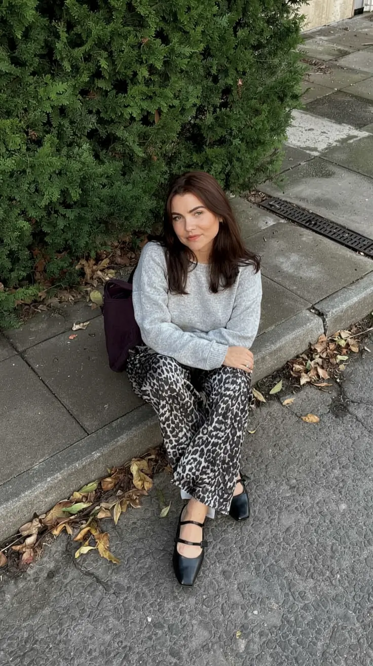 This ensemble is an account of a person who understands how to compromise between comfort and charm. Grey knit cardigan is paired with fierce leopard print trousers, and is topped up with simple black ballet flats. It is easy and dramatic, which is exactly the kind of mood I want in transitional fall weather.