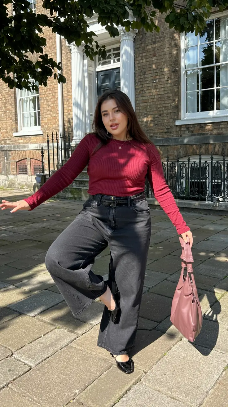 The collarbones are framed by the long sleeve ribbed top, which makes it look elegant, and the high-waisted jeans achieve that hourglass shape that many of us midsize women adore. It is one of the best candidates to be a midsize fall outfits 2025 casual or even a lowkey midsize fall outfits 2025 going out outfit.
