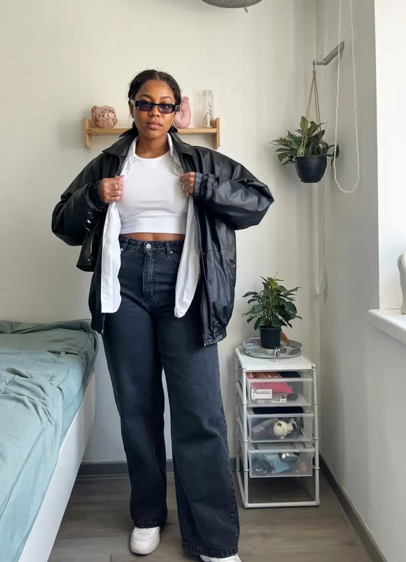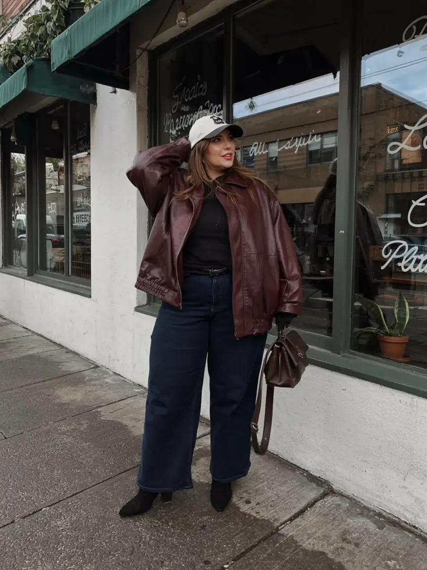 It is either midsize fall outfits 2025 work or midsize fall outfits black women depending on the manner of style. The large outline of the jeans makes the outfit informal yet the leather makes it elegant. It’s one of those quiet power outfits.