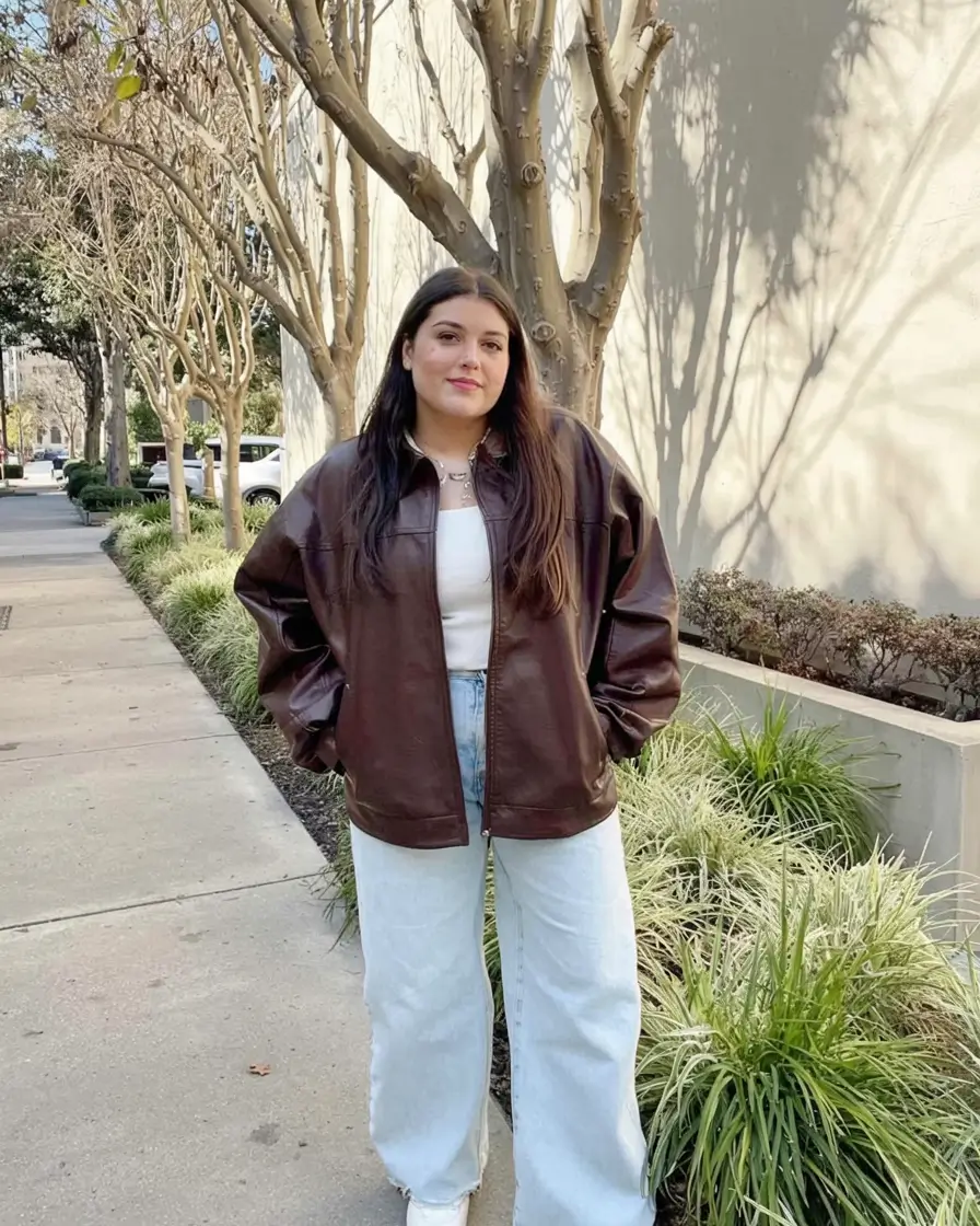 This aesthetic is comfortable, self-assured and coffee-run-or-bookstore-ready. The brown leather jacket is deep brown in color and it gives it a warm as well as structured look, with light-wash baggy jeans and a classic white tank. There’s balance here—dark against light, fitted against loose.