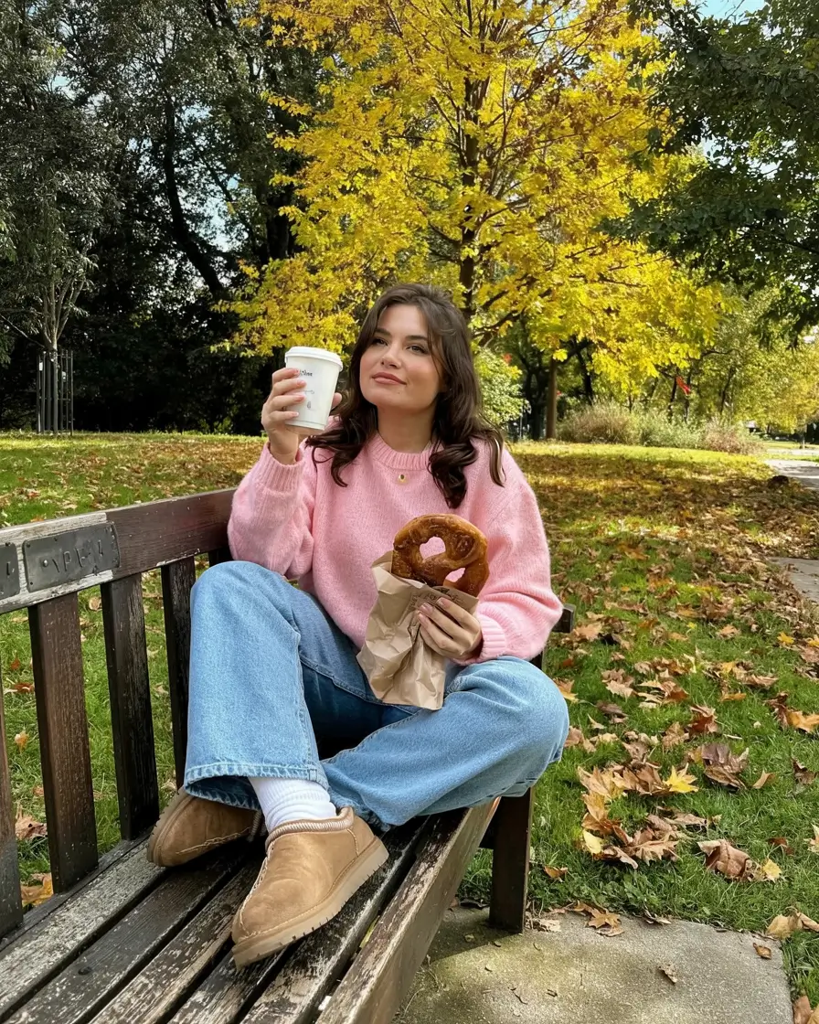 The color scheme, pink, camel, and denim blue, is what truly makes this outfit shine, and the combination of colors feels soft and adorable contrasting with the golden leaves. Aesthetic without trying too hard.