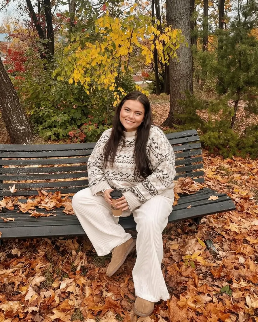 Everything is exaggerated: the forest floor, burning leaves, and a wooden bench in a Hallmark movie. This isn’t just an outfit; it’s an autumnal emotion.