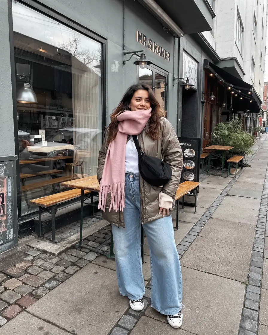 Street style meets softness in this urban winter look. The olive quilted jacket is muted and utilitarian-chic, bringing a solid base to the outfit with a warm volume and cool tones. Wide-leg light-wash jeans give the outfit a breezy, loose silhouette and goes with the ever timeless black Converse.