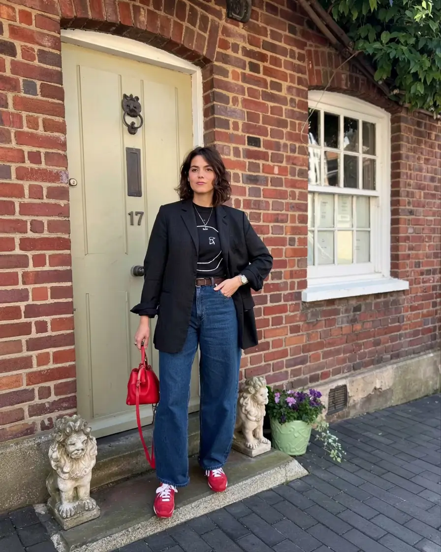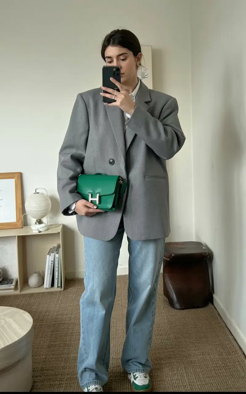 There’s something undeniably chic about combining tailored pieces with sporty staples—and this look nails it. The oversized wool blazer provides the necessary structure to give balance to those wide-leg dark jeans and vintage-style sneakers. It’s quiet luxury, with a laid-back edge. Totally wearable, totally now.