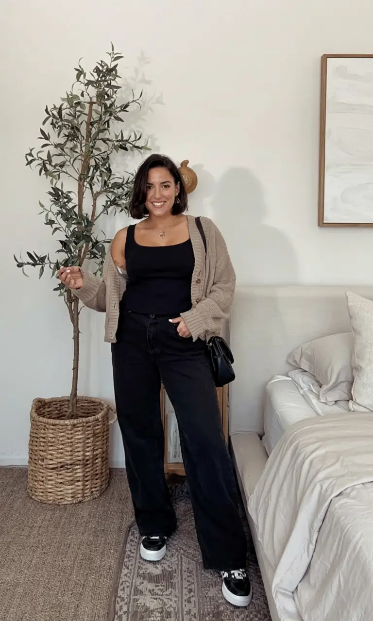 This is the type of style I go to when I want to feel like me. Black tank, hidden in soft charcoal wide-leg jeans, a slouchy taupe cardigan, and you will feel polished and comfortable at once. Effortlessly cool, endlessly flattering.