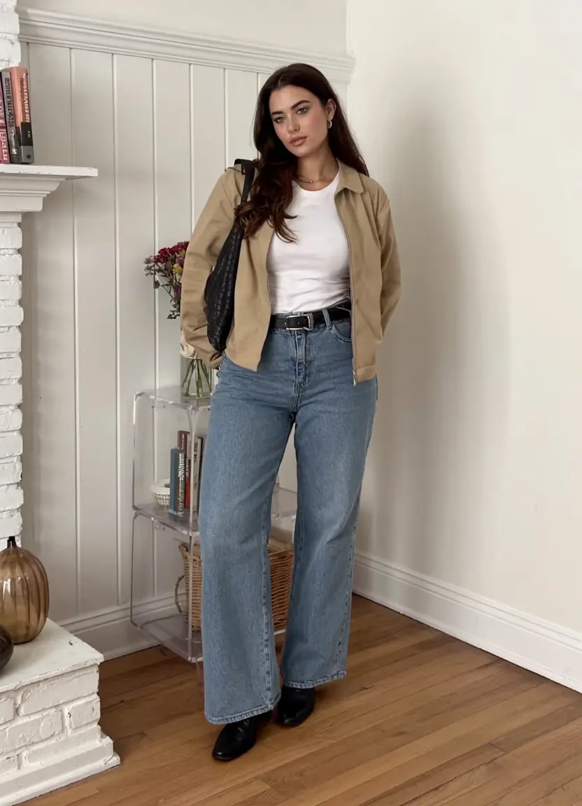 Now, about shape- this jacket is cut right above the hip which makes the legs appear longer. The jeans are a bit cropped and raw hemmed to give the structure without being stiff. Coupled with a soft neutral palette, it is the ideal foundation of midsize fall outfits 2025 work or midsize fall outfits dressy based on the accessories you use.