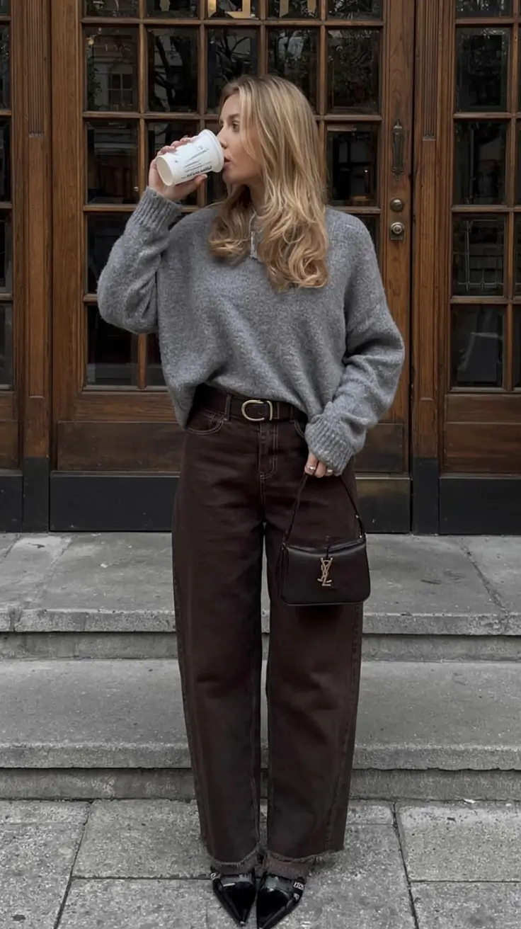 The wide-leg chocolate trousers are everything. They cinch the waist, skim over the hips, and pair beautifully with pointed patent shoes (extra points for the sock styling—unexpected but chic). And that grey oversized sweater? The ones you just put on and don t ever want to take off. Then add a small YSL bag, just a hint of refined flashiness, and this becomes one of those mid size fall outfits 2025 casual looks that is actually fancy.