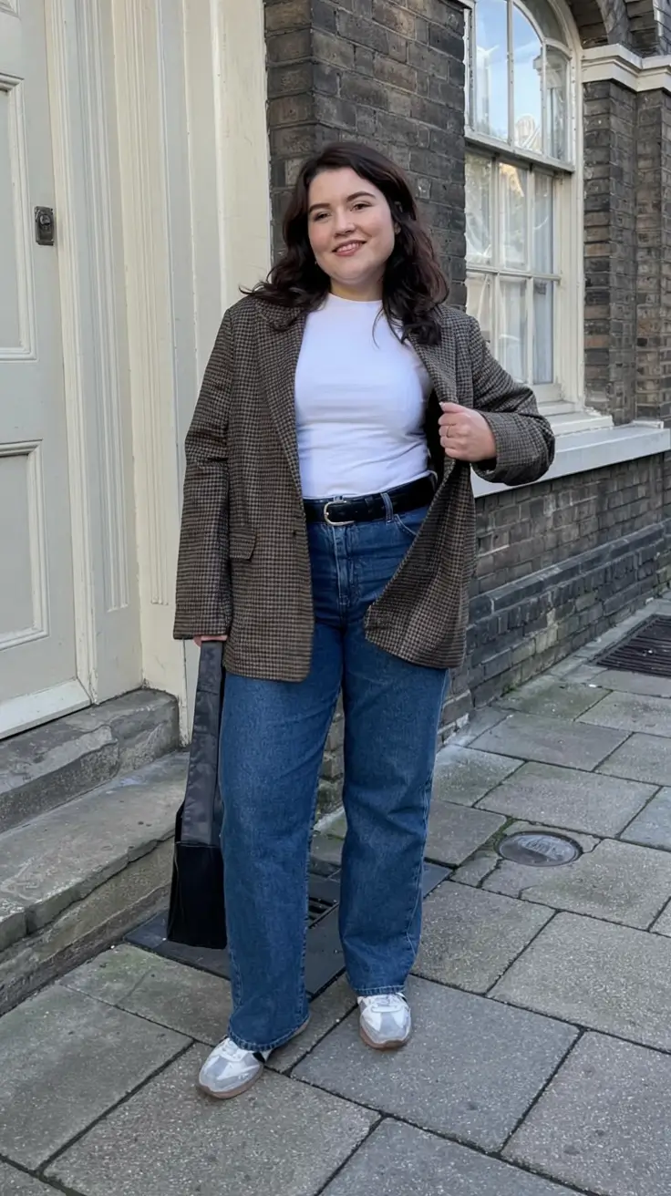 This is the face to put on when you need to present smart and sweet without sacrificing comfort. The combination of a clean white t-shirt worn with mid-wash straight-leg jeans and held together by a brown checked blazer is serving up retro revival with a contemporary flair. This is the way you make basics and take that midsize fall outfits 2025 work lane with assurance without wearing heels.