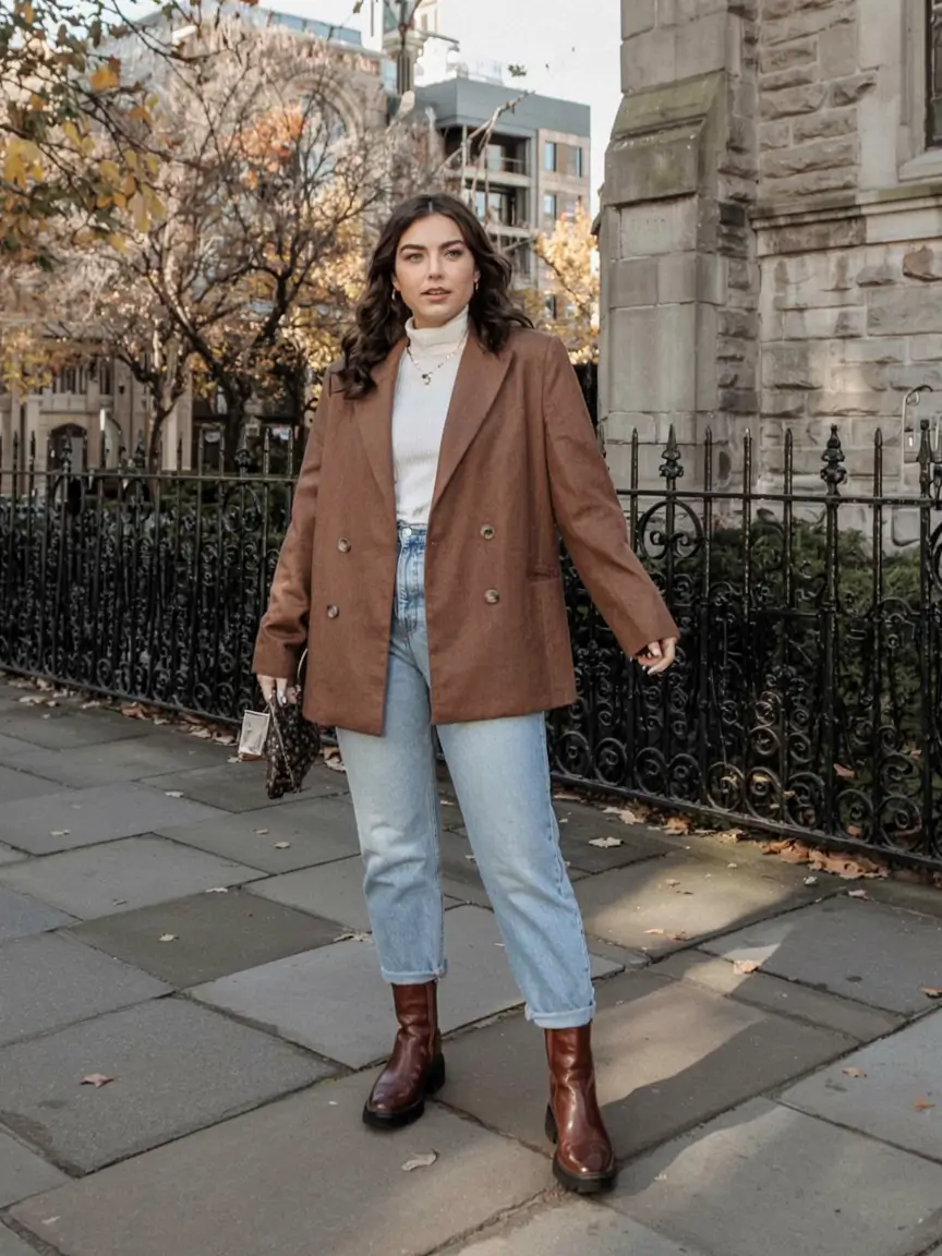 There is something about this ensemble that seems like a mic drop in action. The blazer, rich in the mocha color, with its structure and a bit oversized, combined with a cream turtleneck and light blue jeans, straddles the borders of power and gentleness in the most natural way. Not too snug but not too sloppy, not too fancy but not too extra, it is a formula of success in midsize fall outfits 2025 dressy or even a daring daywear outfit.