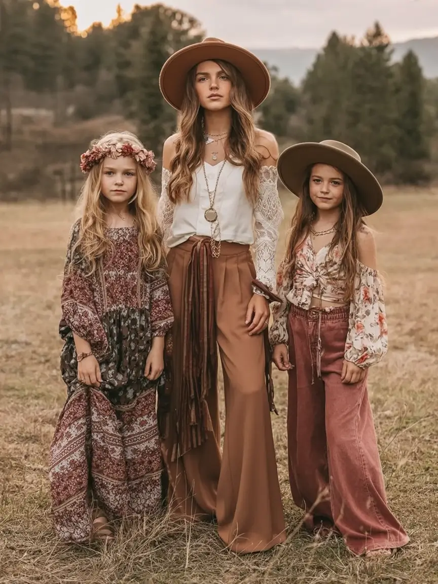 Long fringes, earthy colors, wide-legged pants, and soft lace sleeves- this outfit is not only a moment but a mood. I have always been fond of a family photo outfits fall idea that involves a feeling of heritage and story, and this one fits all the boxes. The neutral colors anchor the picture into the fall season, and the overlapping gives it a sense of motion that is so lovely against the background of an open field. And those wide-brimmed hats? A quiet power move.