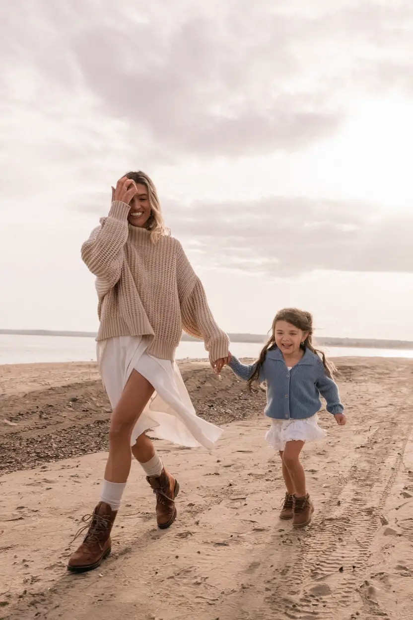 Mom is in a thick beige knit with a flowing white dress and lace-up boots. The small child is dressed in her own white dress, neutral socks, and a cute blue cardigan, which is a slight reference to the family photo outfits fall blue without pushing the palette too far off neutral. This is simplicity done with intention.