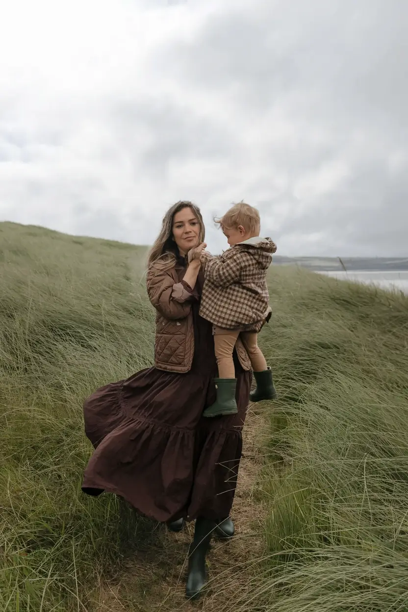 In case you are in the market to find something that is sort of British countryside, sort of cozy coastal October, this is fall poetry. The tiered skirt in dark chocolate topped with olive quilted jacket is both down to earth and trendy, ideal to wear on a cold day and in the wind. The green boots and caramel legging with micro-houndstooth shacket of the child connects indirectly with the overall earthiness.