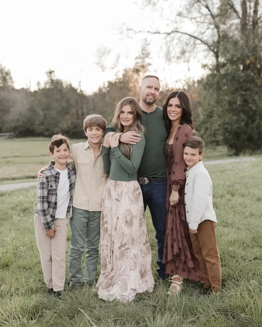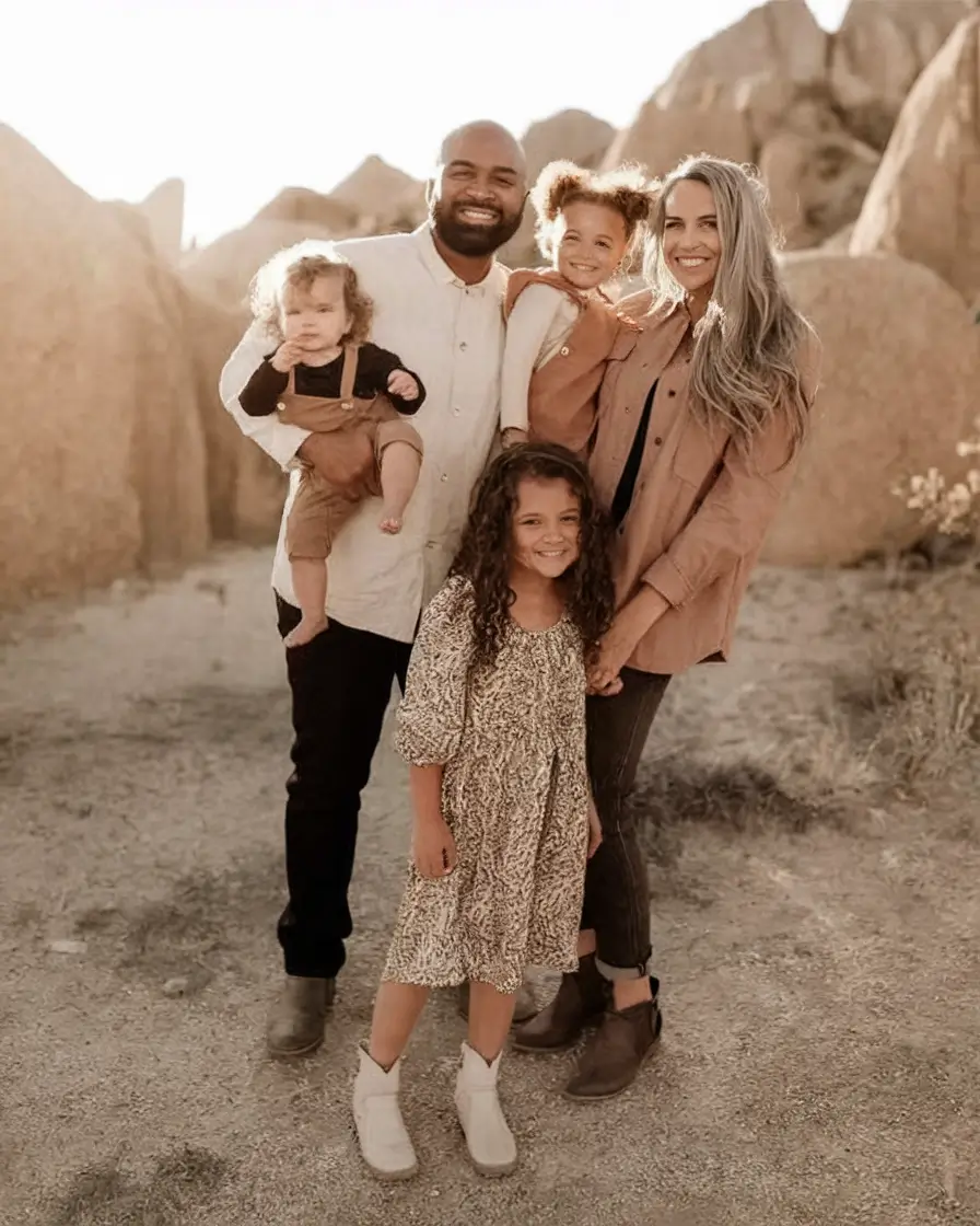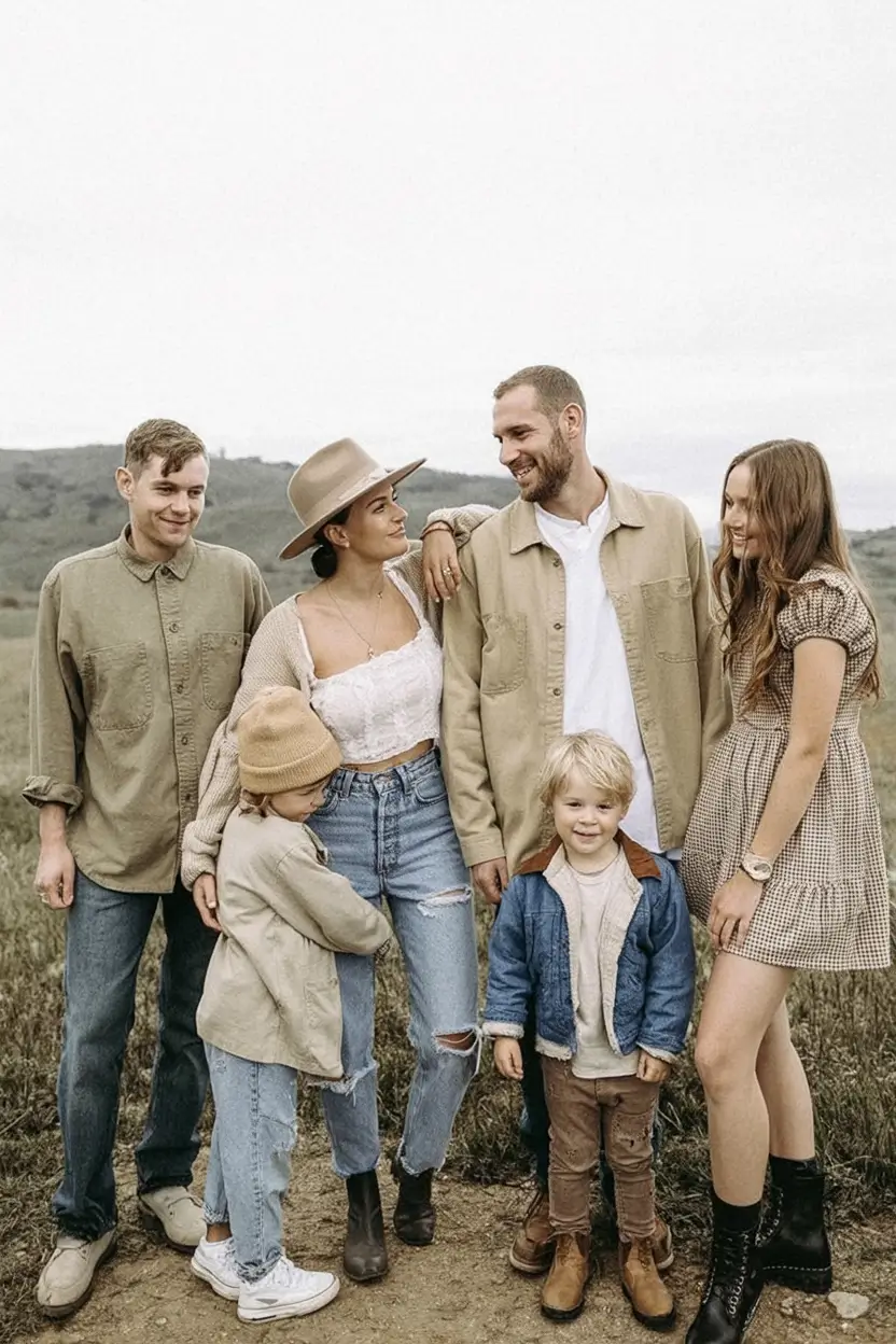 It seems that this family group was created to be shot in golden light. The contrast between soft neutrals and sand-washed earth tones and rustic patterns is amazing here, everything is very intentional yet not too strict. In case you are inclined towards family photo outfits fall neutral or family photo outfits fall casual, this combination will provide you with a lesson in balance: simple with a touch of detail.