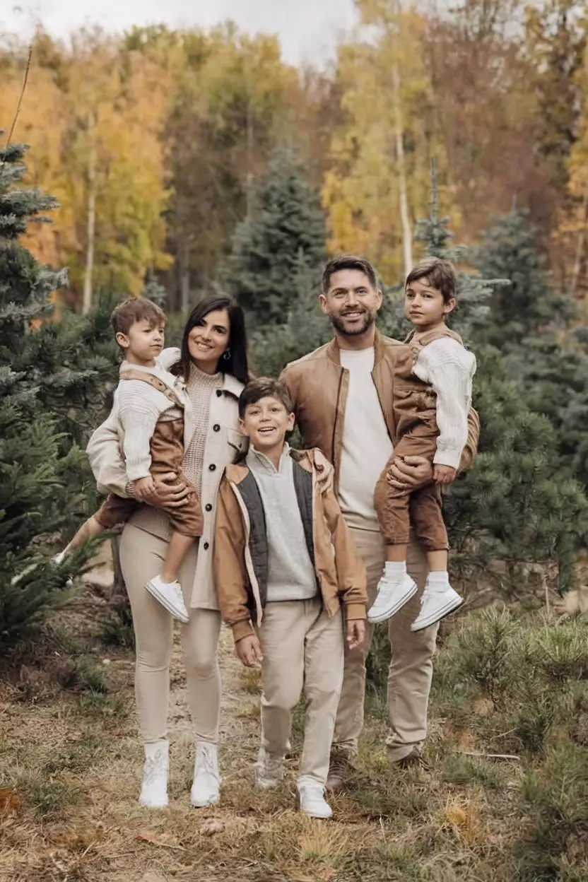 The outfit of Mom especially is an ideal layering blueprint: oatmeal coat, textured sweater, heeled boots and soft cream leggings. It’s modern and functional. Dad keeps it laid-back with a caramel jacket, while the boys mirror their parents’ tones in various shades of beige and khaki. It also happens to be great on family photo outfits fall plus size, where there is much forgiveness of silhouette and soft verticals.