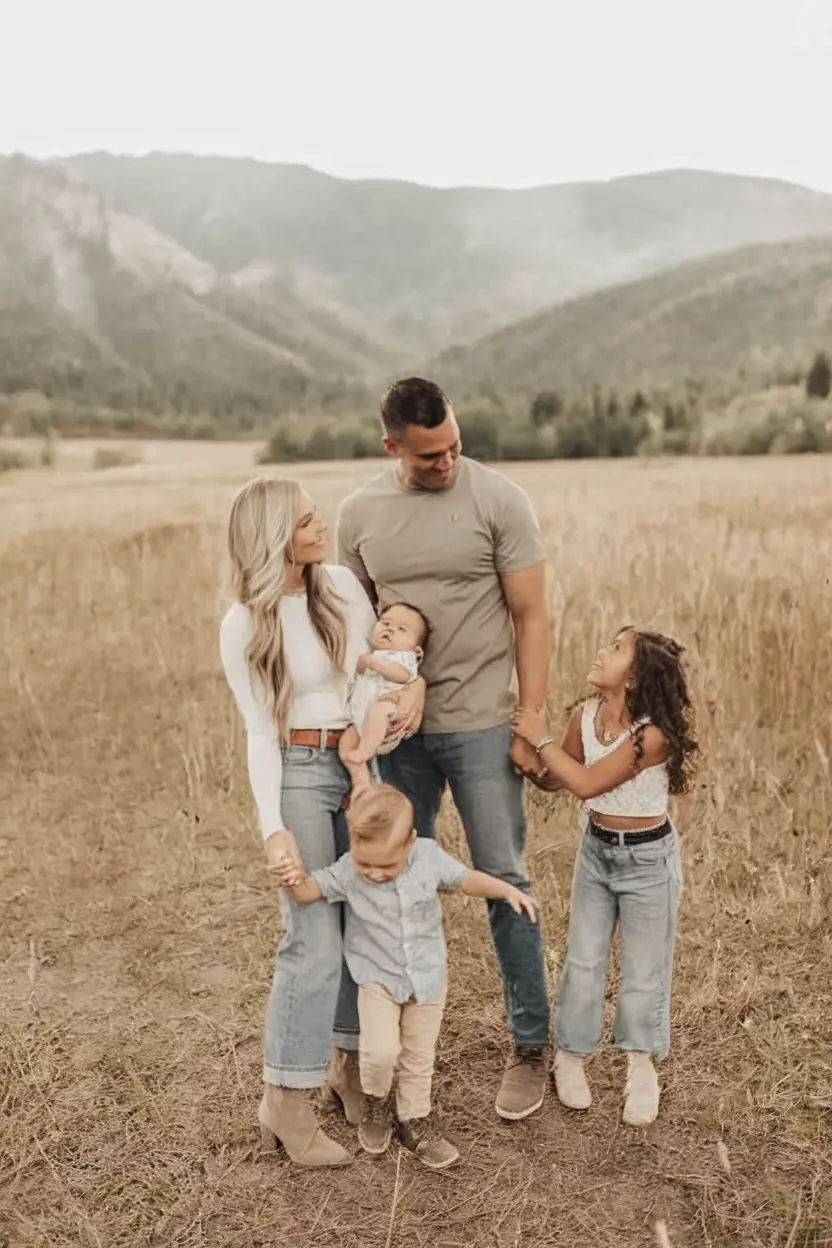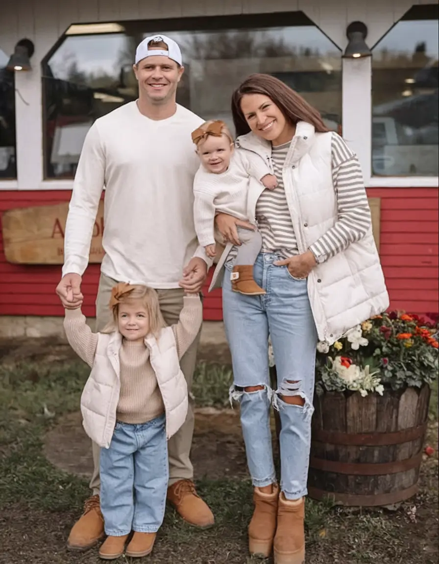 The two children are both in light-wash jeans and chunky sweaters with puffy ivory vests on top of them, a combination that never fails when it comes to family photo outfit ideas fall jeans inspiration. Dad is in shades of beige and khaki, and mom in distress skinnies and Ugg platforms. Together it’s classic, but definitely not boring.