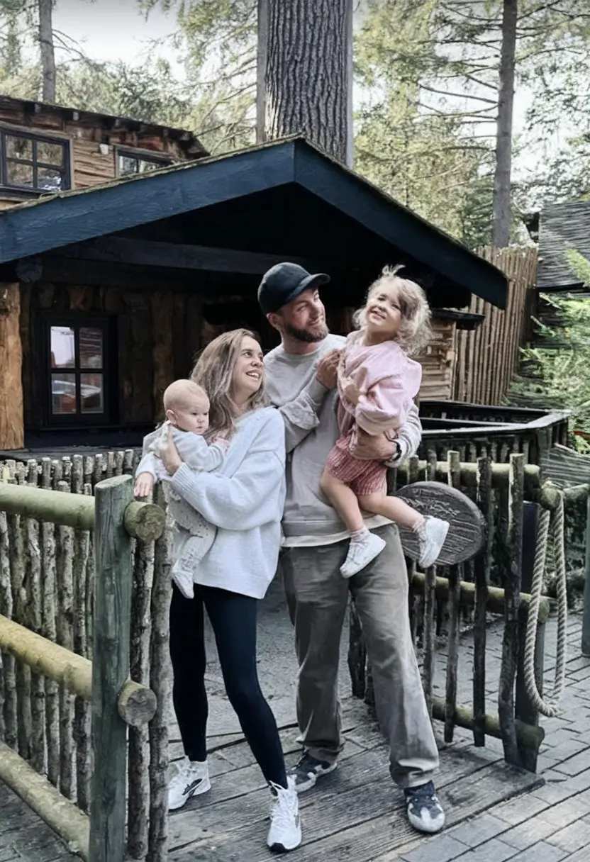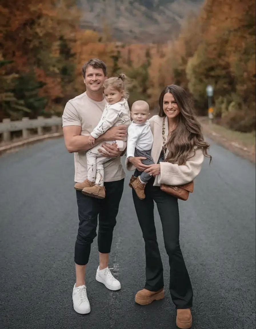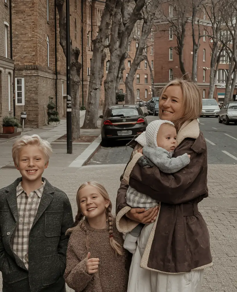 Mom wears a cable-knit sweater with a flowing olive skirt, a blush hat and some soft curls. Dad’s forest-green flannel keeps it grounded, and the twins’ outfits mirror mom’s palette with a mini-me twist — soft, cozy, and timeless. I also adore the fact that the family appears to be united without one-star outfit.