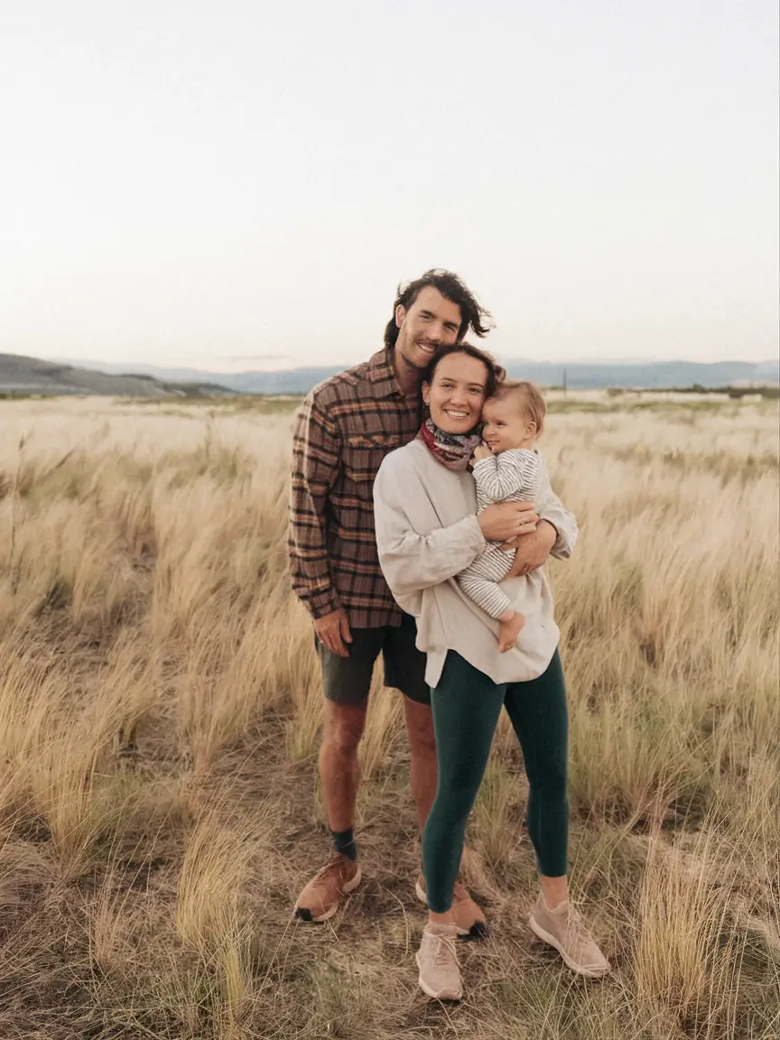 If you’re going for relaxed, movement-friendly, and mood-rich, this trio strikes a perfect chord. The dad’s caramel plaid shirt sets a fall tone that’s both classic and slightly rugged, while mom’s oversized sweatshirt and leggings offer warmth without heaviness. Their color scheme of oatmeal, hunter green and dusty blush mingle seamlessly with dry grasslands and cool evening skies.