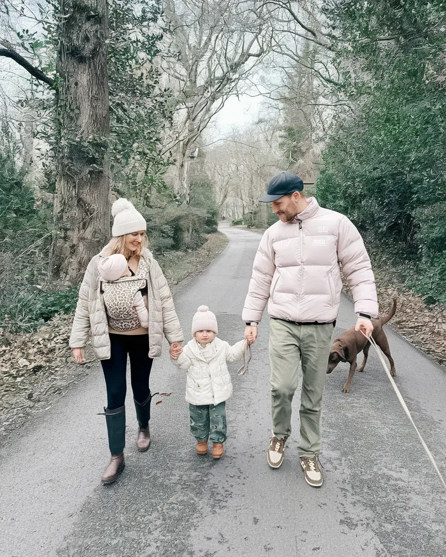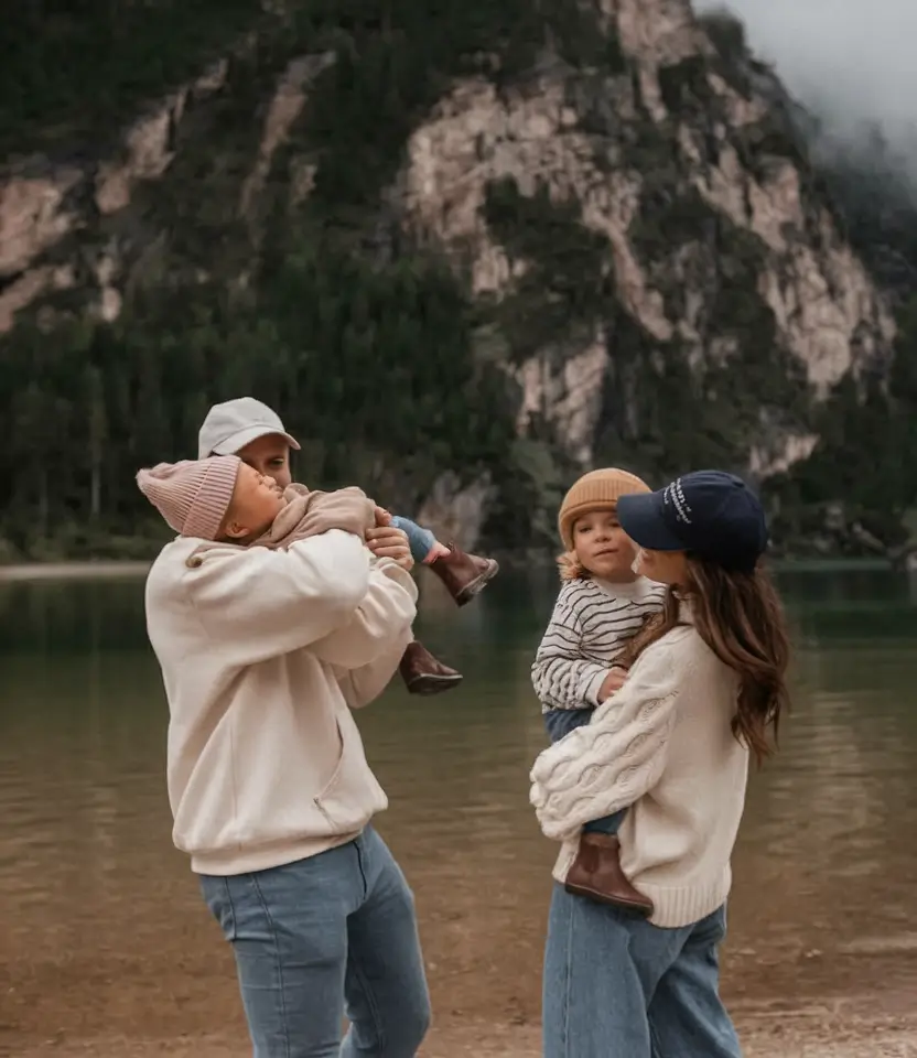 The child is sandwiched between the two parents as he is held up by the mother. The toddler is fully relaxed with a big and joyous smile and rosy cheeks. They are dressed in a cream sherpa jacket and neutral trousers, with brown teeny boots – autumnal to perfection.