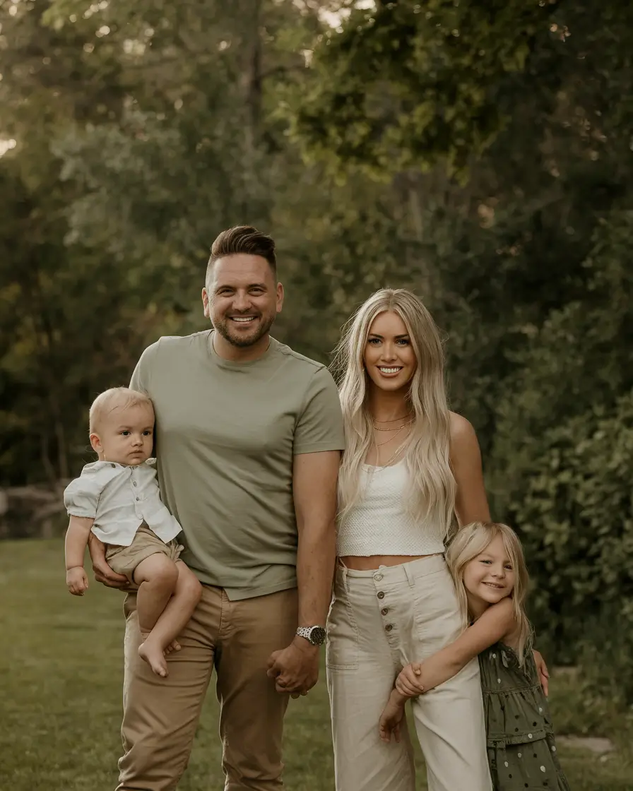 Soft beige, sage and white in the background of warm green trees is somehow nearly poetic. The family outfit is constructed on the base of warm family-photograph outfits fall neutral coloring of the coloring which are excellent in a casual affectionate atmosphere which is not overly-striving. The little girl’s ruffled olive dress brings a playful contrast to the parents’ structured, simple silhouettes, while the baby in sandy tones pulls it all together like punctuation.