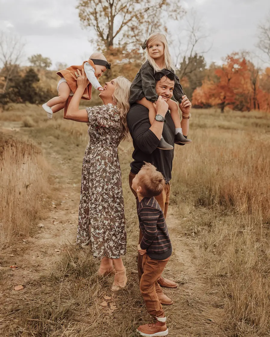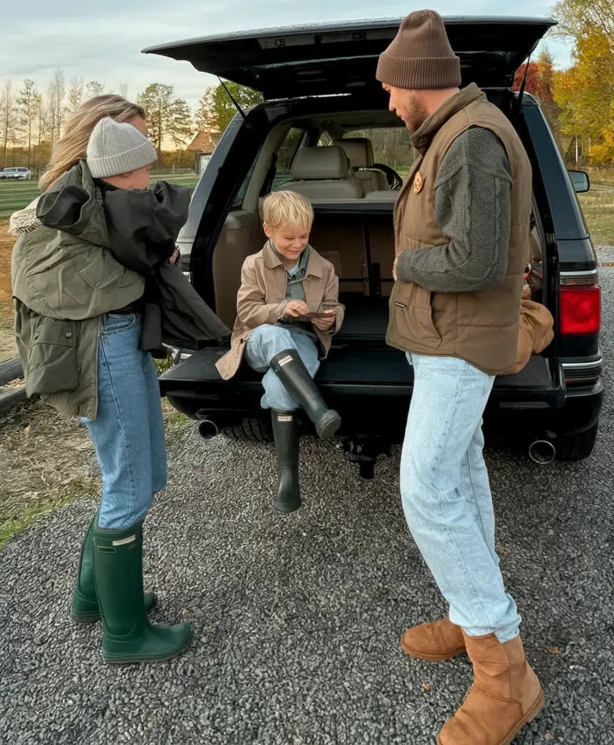 It is cinematic to have a tailgate scene surrounded by gravel and golden trees. This family knocks a country, Americana look with waxed jackets, green wellies, knitted beanies, and shearling pieces, straight up country chic. If you’re thinking family photo outfits fall jeans with a twist, this delivers.